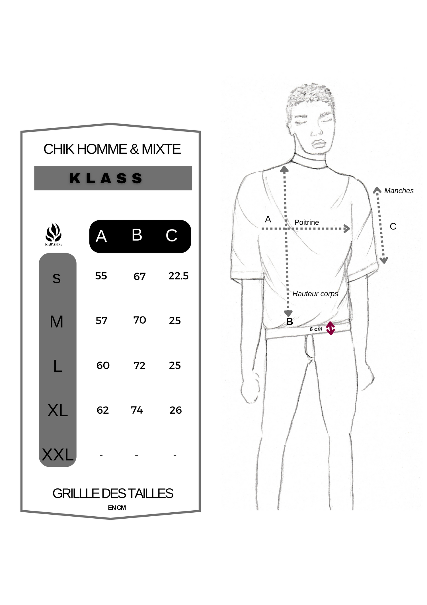 Nos produits se distinguent par des coupes uniques, conçues avec soin pour garantir un style et un confort inégalés. Afin de vous accompagner au mieux dans votre choix, nous mettons à votre disposition un guide des tailles détaillé.