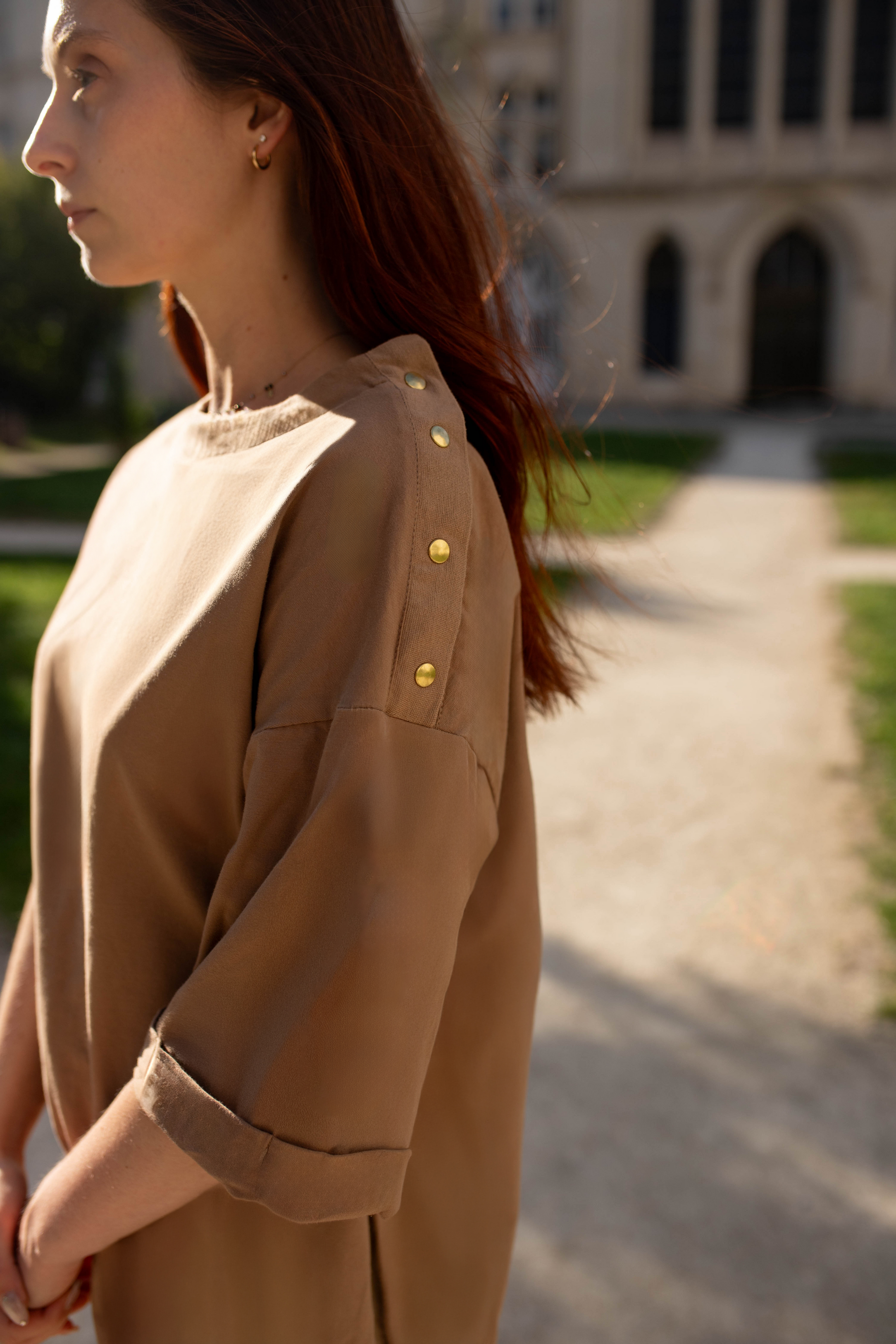La coupe classique femme de la collection Génésis au design original est l’essentiel parfait pour un usage quotidien. Son look oversize et son caractère polyvalent s’adapte à toutes les occasions et peut se porter avec un bas évasé ou prêt du corps.