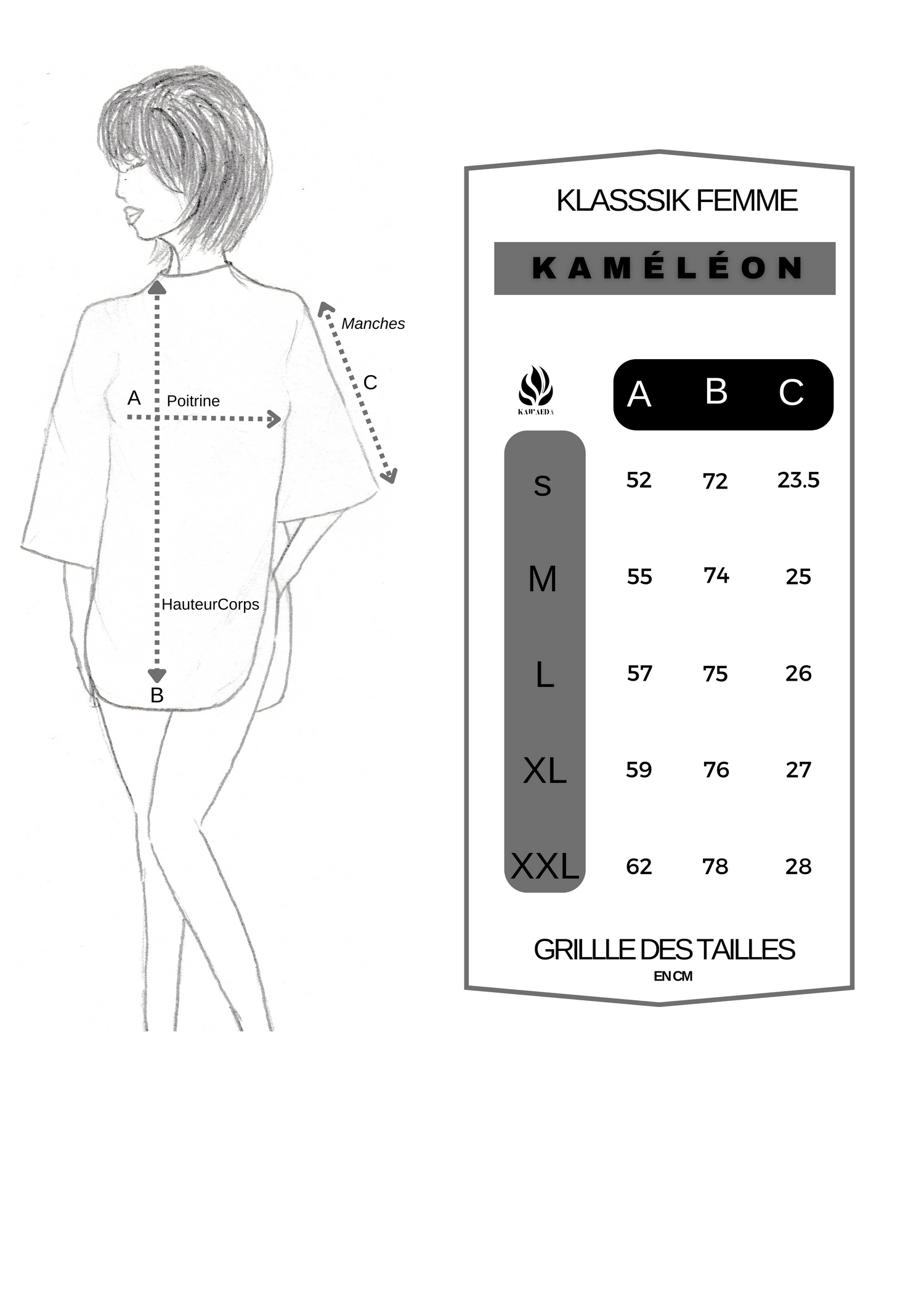 Nos produits se distinguent par des coupes uniques, conçues avec soin pour garantir un style et un confort inégalés. Afin de vous accompagner au mieux dans votre choix, nous mettons à votre disposition un guide des tailles détaillé.